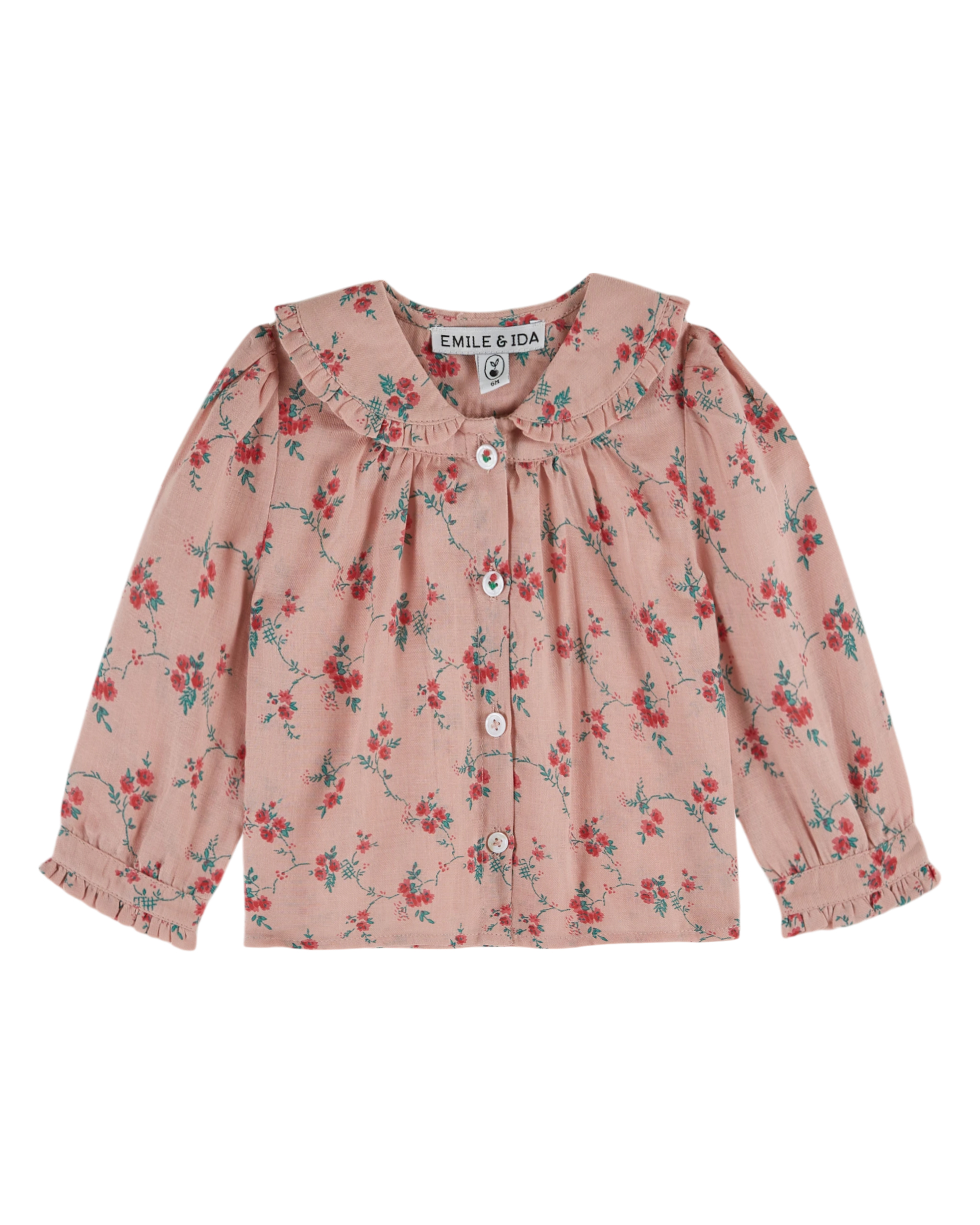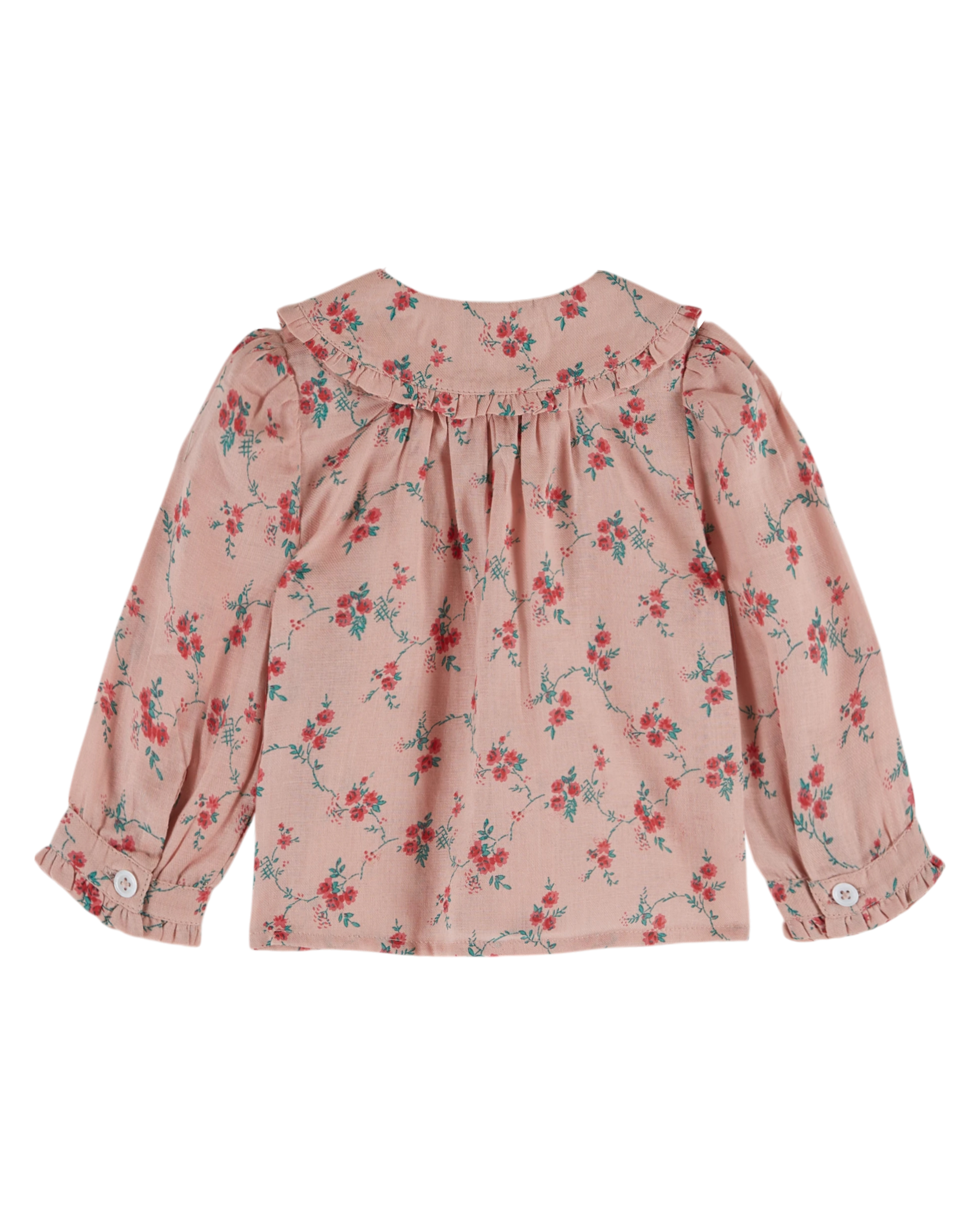 Blouse en coton orné de bouquets fleuris sur fond rose.