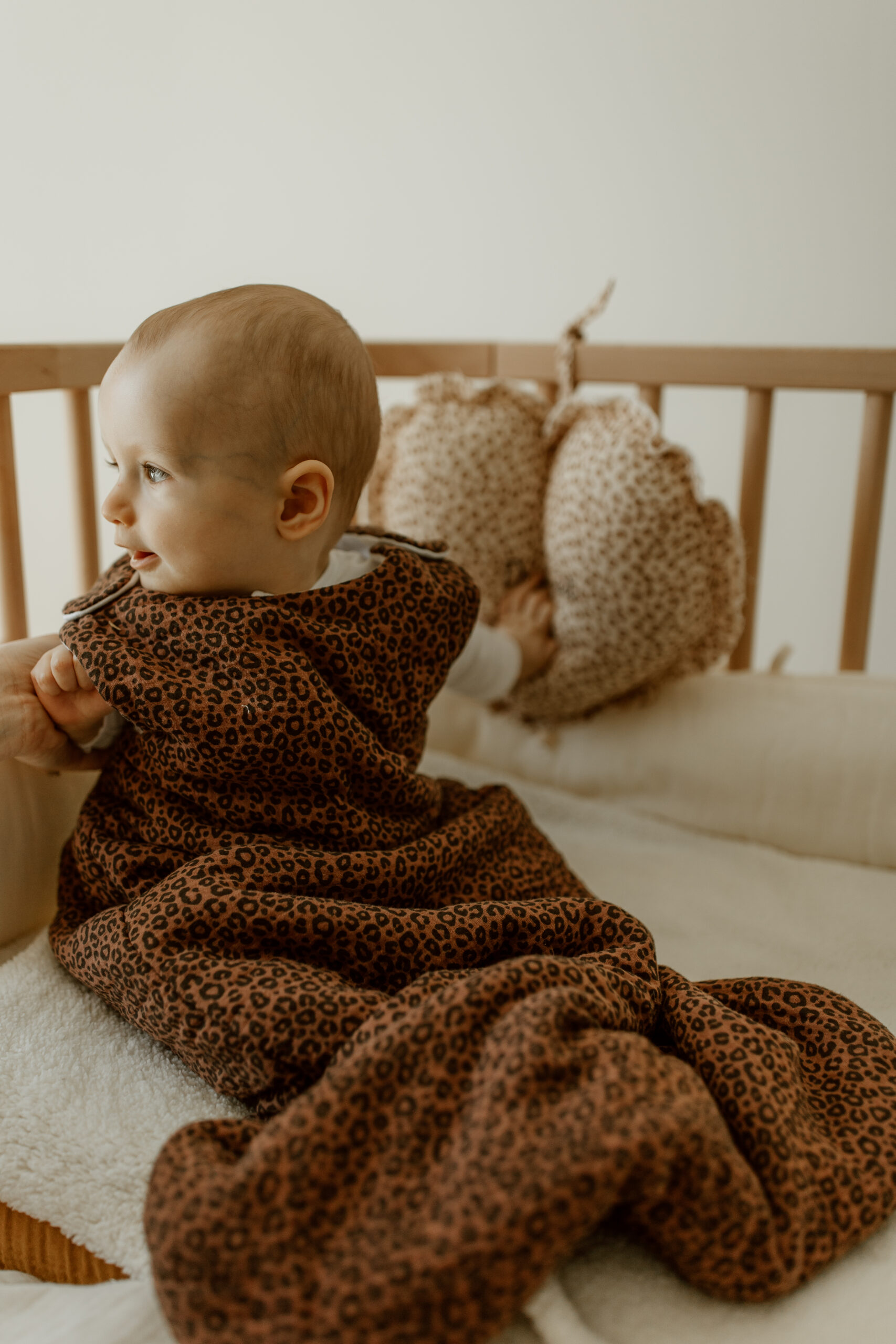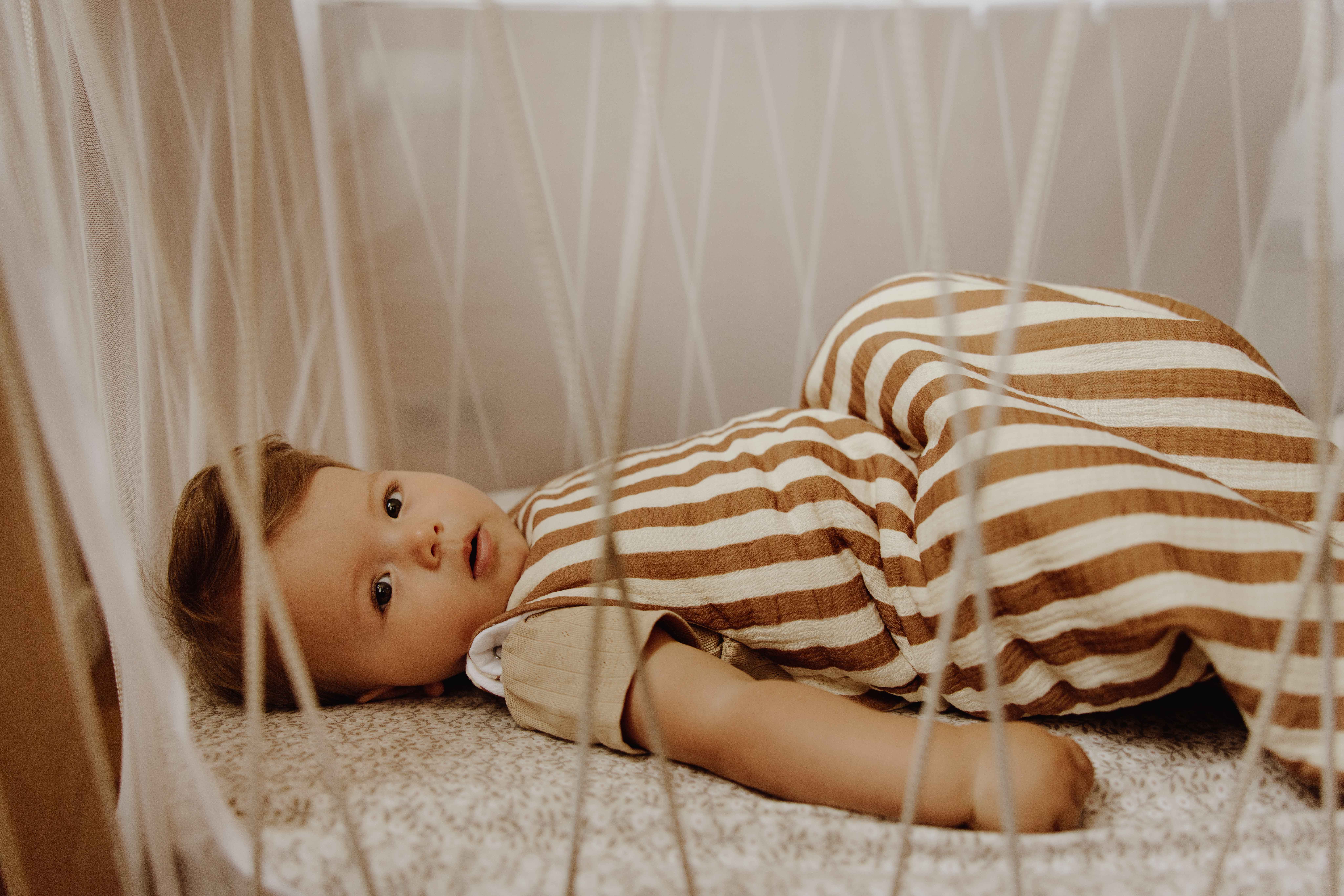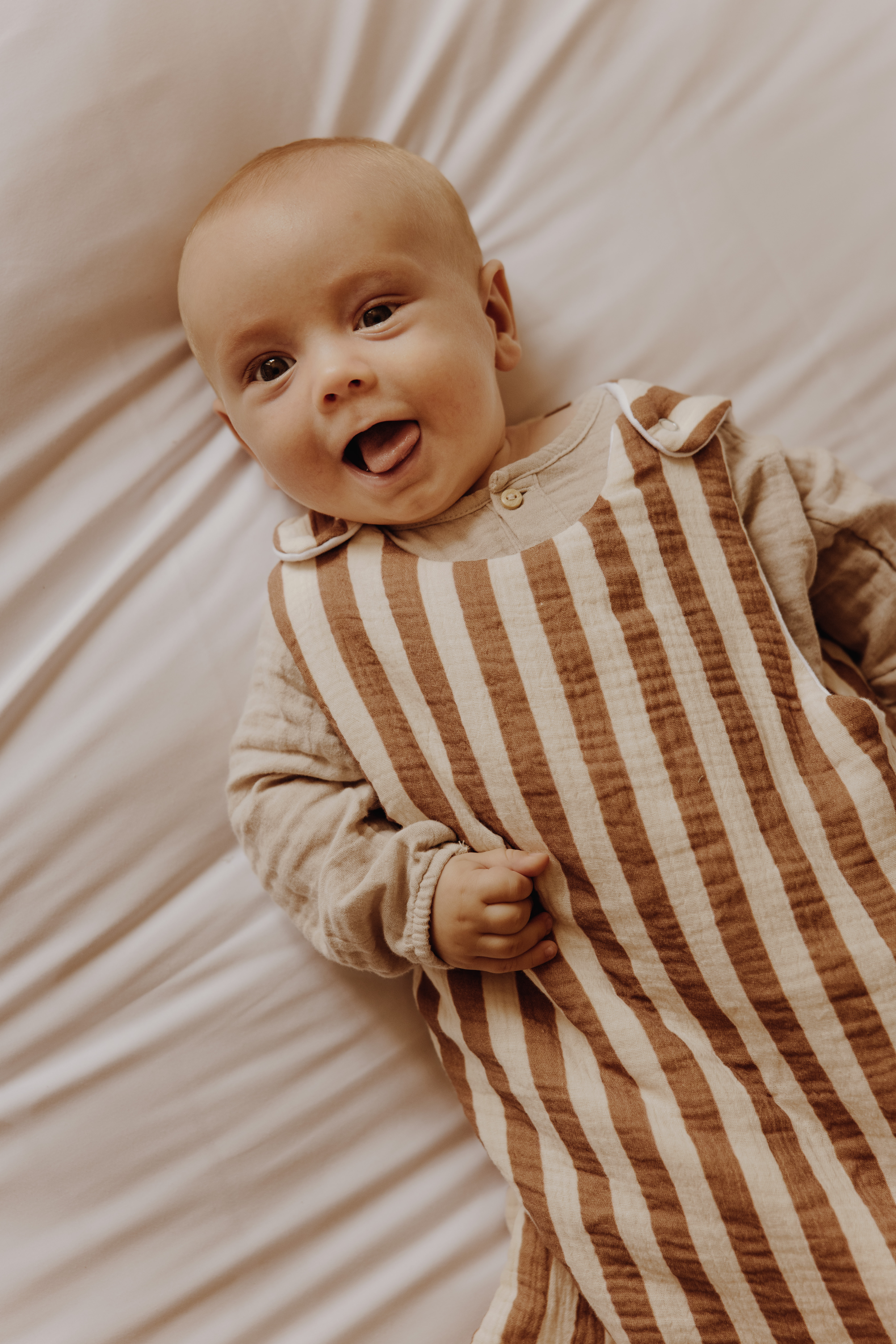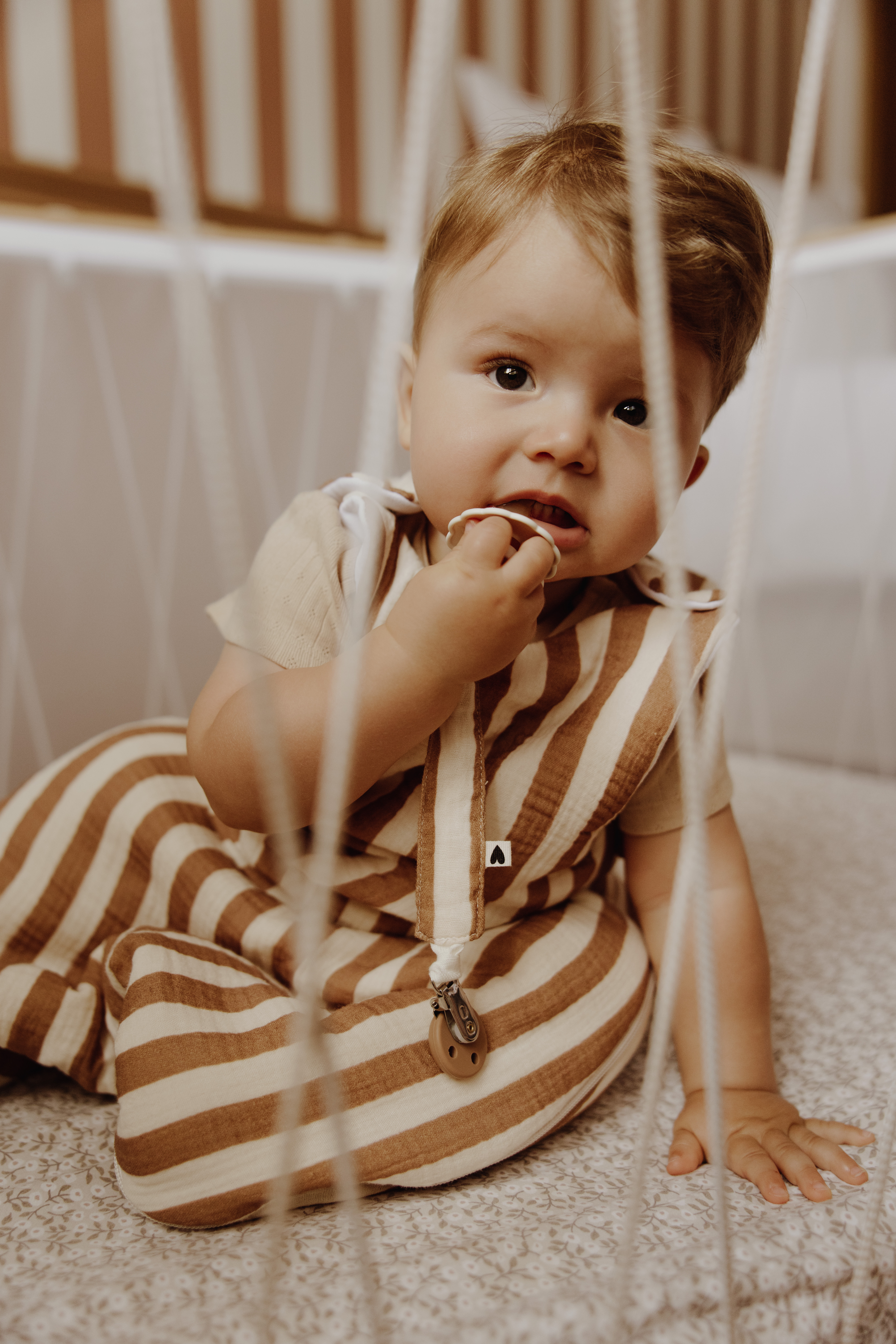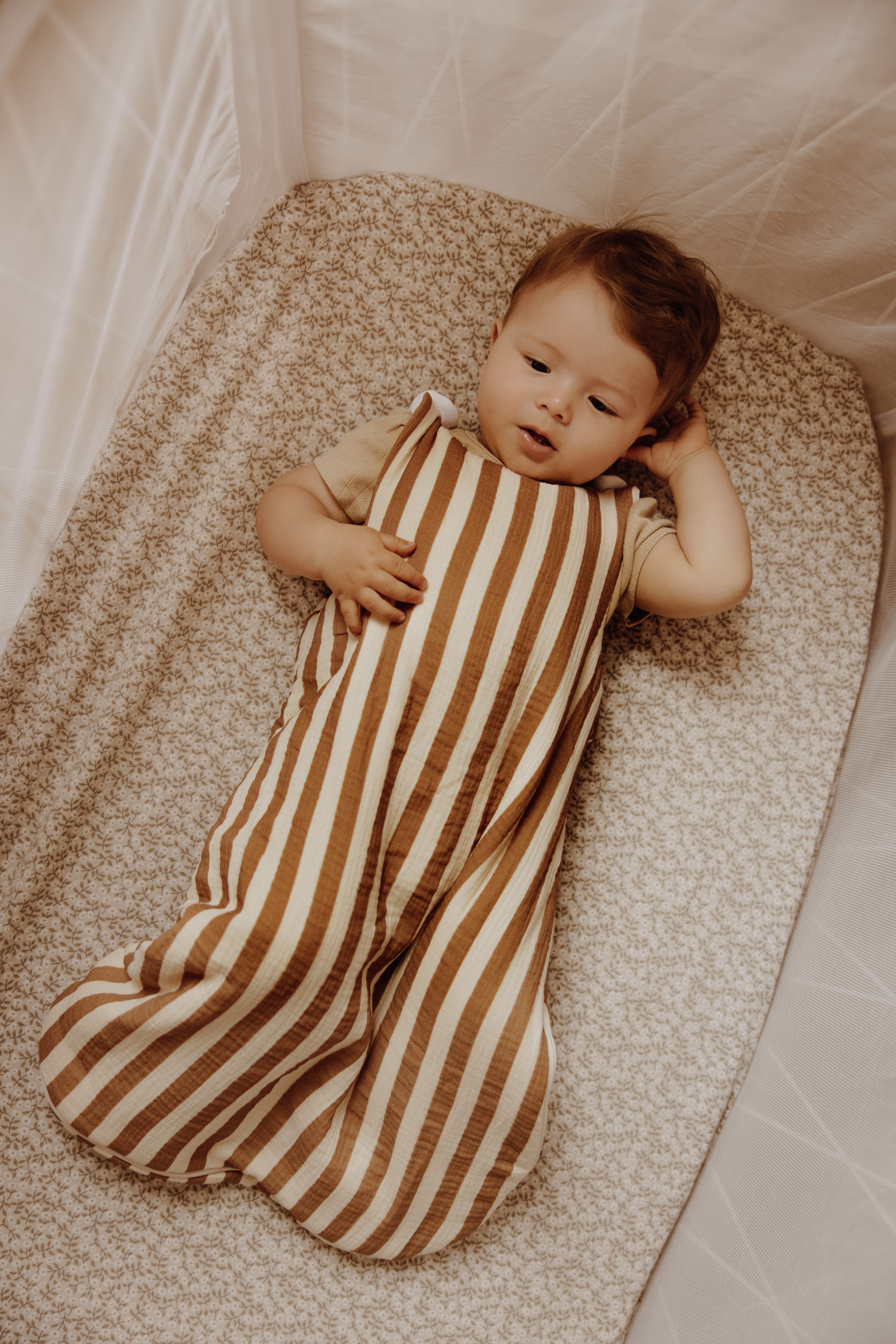 Gigoteuse en gaze de coton imprimé rayures camel.