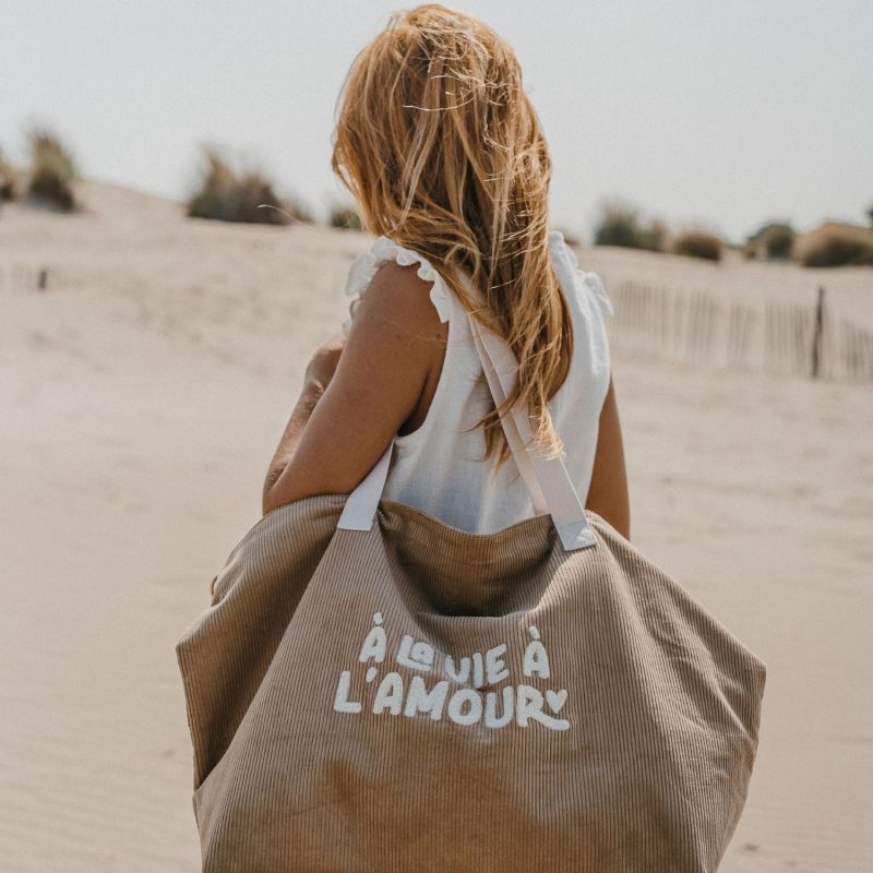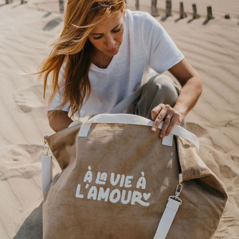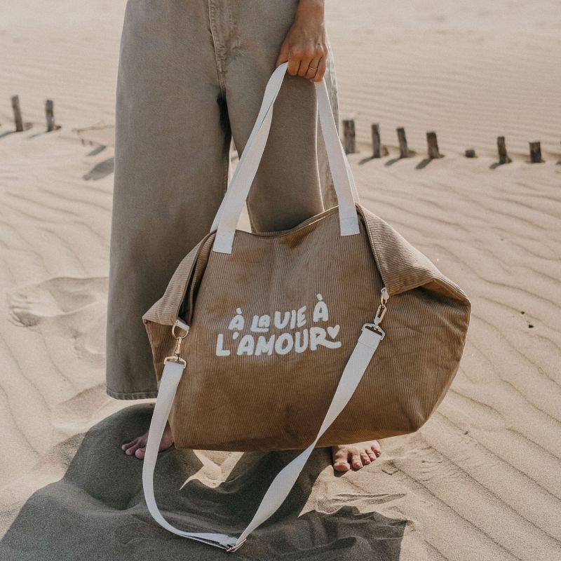 Parce qu’un sac n’est jamais trop grand, ce cabas en velours côtelé vous accompagne dans toutes vos aventures : sorties en famille, escapades le temps d’un week-end ou encore pour glisser les affaires de sport des enfants. Son format XL accueille tout ce dont vous avez besoin sans compromis sur le confort. Sa fermeture éclair garde vos effets en sécurité, tandis que sa bandoulière réglable vous permet de le porter à l’épaule ou en travers du corps. Avec sa délicate broderie « À la vie à l’amour », ce sac apporte une touche moderne et pleine de charme à vos journées.